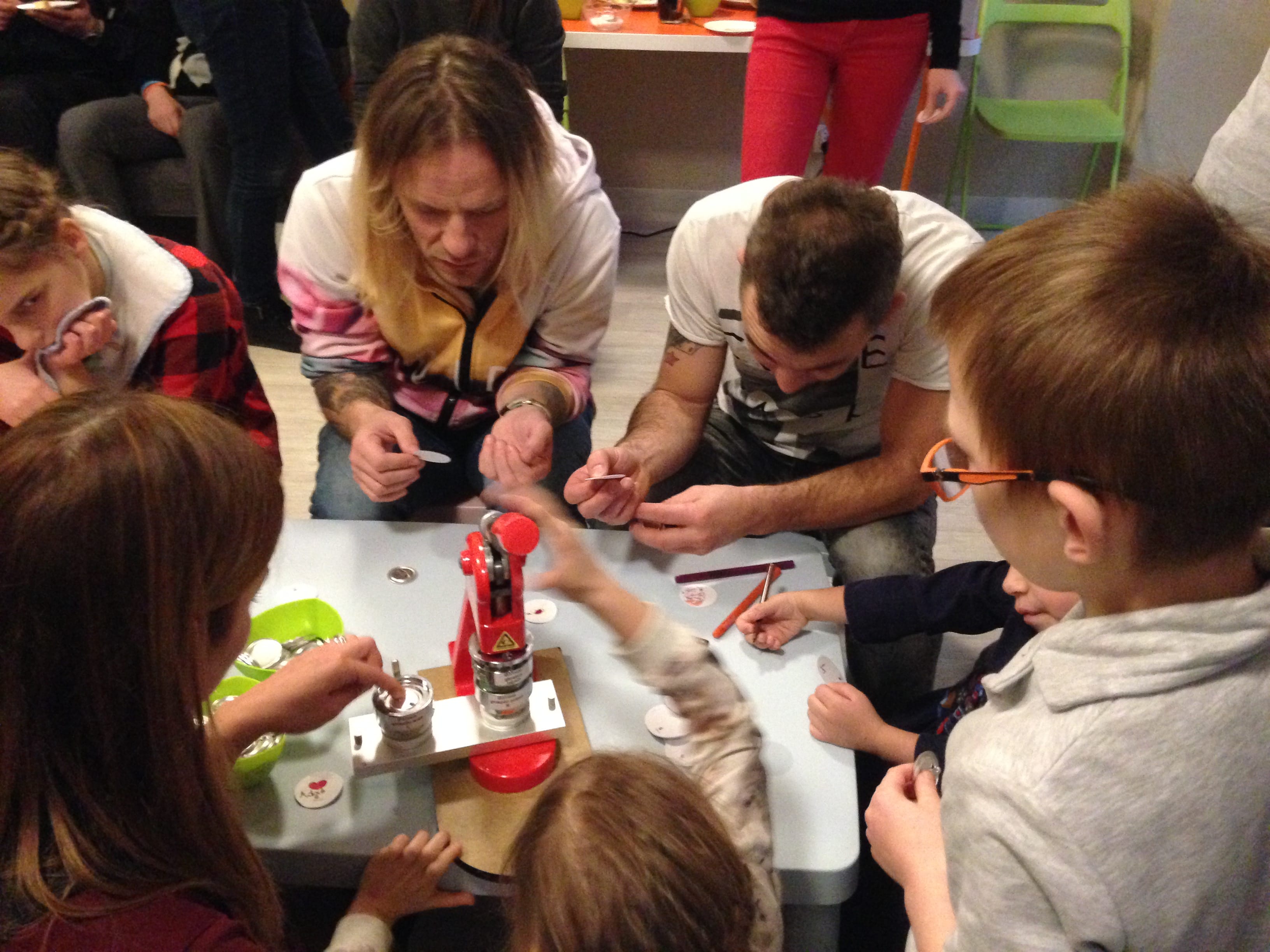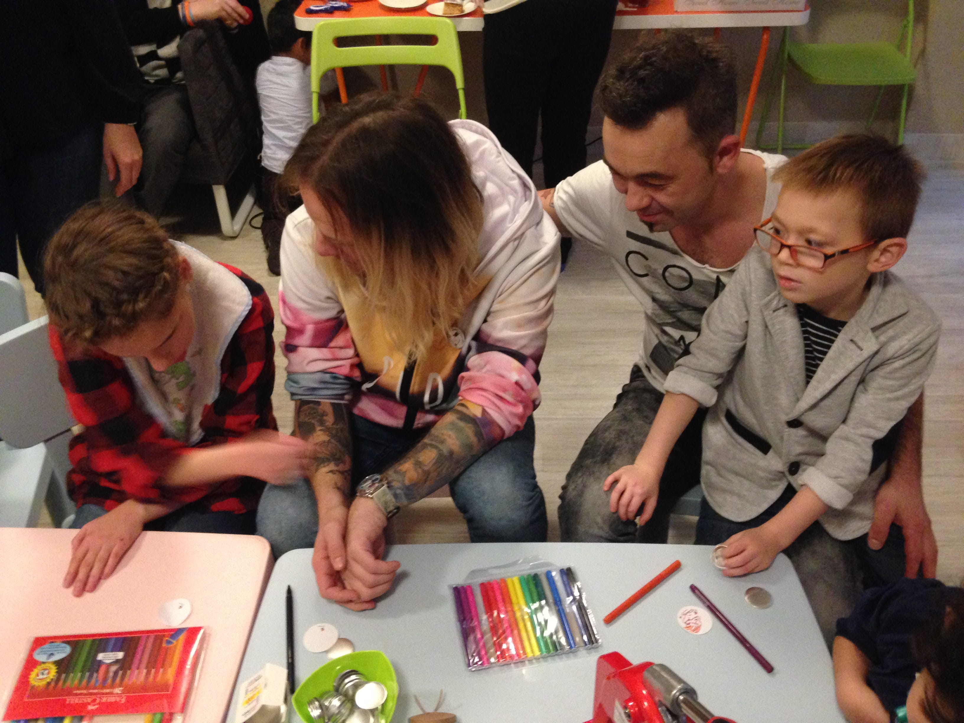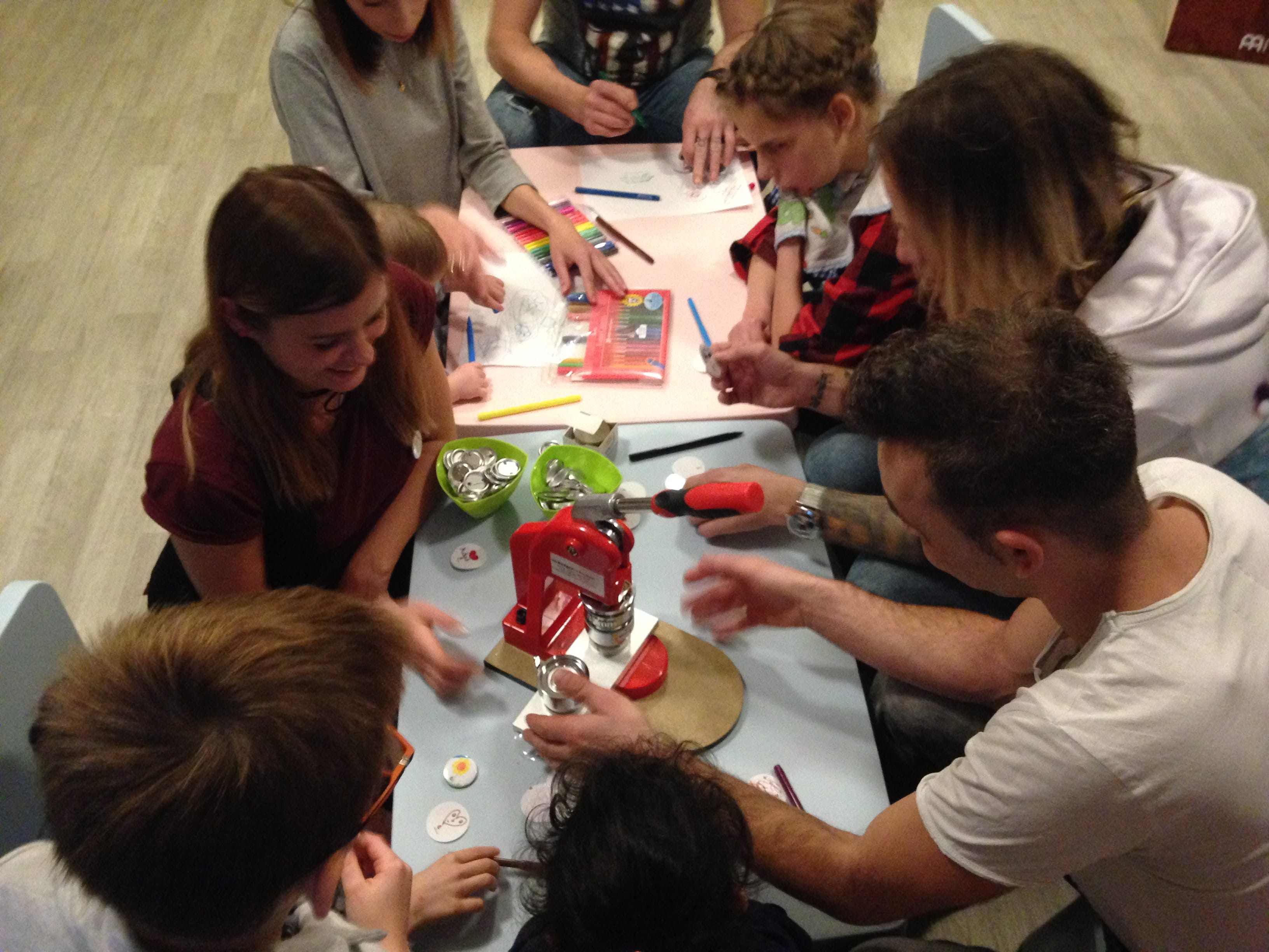 Potem zasiedliśmy do wspólnego rysowania. Wspaniale bawiliśmy się robiąc własnoręcznie przypinki. Julka, Asia i Marcin uczyli Muzyków, jak to się robi – krok po kroku. Wszystko wyszło doskonale!